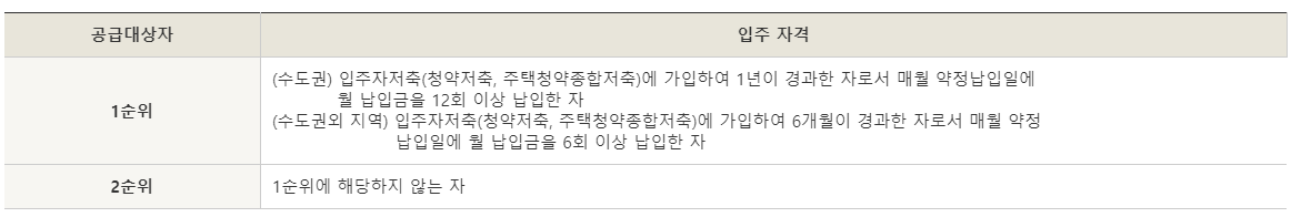 먼저 1순위는 수도권 기준 입주자저출에 가입하여 1년이 경과한 자로서 매월 약정납입일에 월 납입금을 12회 이상 납입한 자, 수도권 외 지역은 입주자 저축에 가입하여 6개월이 경과한 자로서 매월 약정납입일에 월 납입금을 6회 이상 납입한자 입니다. 그외는 공공임대아파트 입주조건 2순위에 해당합니다. 수도권 기준 입주자저축기간이 1년 미만이거나, 수도권 외 지역 기준 6회 미만이면 공공임대아파트 입주조건 2순위라고 생각하시면 됩니다.