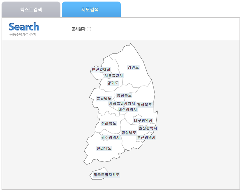공동주택 공시가격열람 방법 설명을 마치도록 하겠는데 지도검색을 클릭하면 나오는 화면입니다. 지도검색이 편하시면 지도검색을 통해서 공동주택 공시가격열람을 해보시기바랍니다.