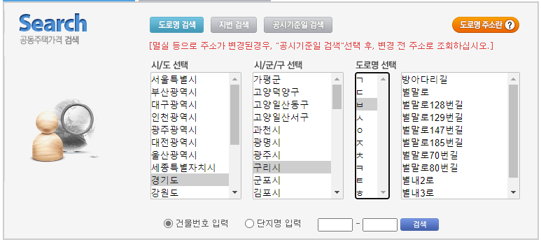경기도, 구리시, 도로명을 ㅂ 으로 선택하니 ㅂ 으로 시작하는 모든 도로명들이 검색됩니다.