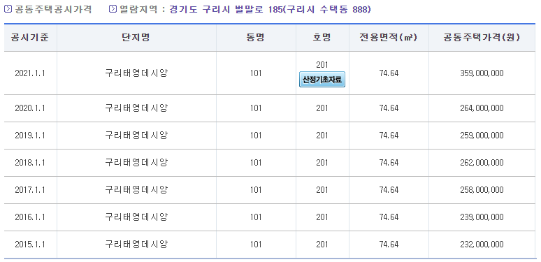 열람버튼을 클릭하고나면 아래쪽에서 공동주택 공시가격을 확인할 수 있습니다.