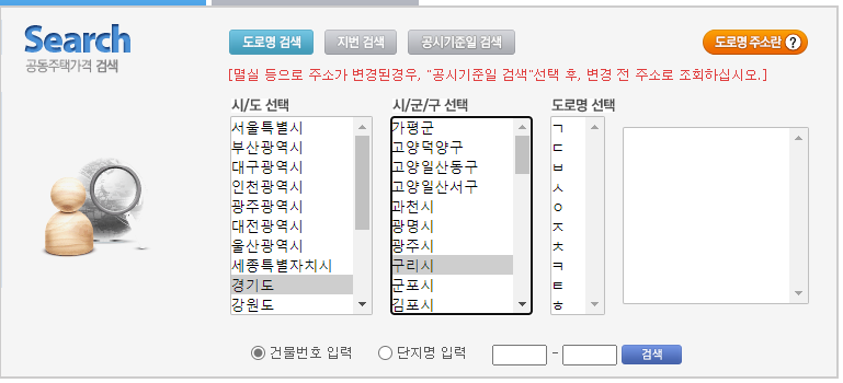 텍스트로는 도로명, 지번, 공시기준일을 선택해서 열람을 하실 수 있습니다. 도로명으로 열람을 해보도록 할텐데 도로명으로 검색을 하려면 먼저 시/도를 선택하여야 합니다.