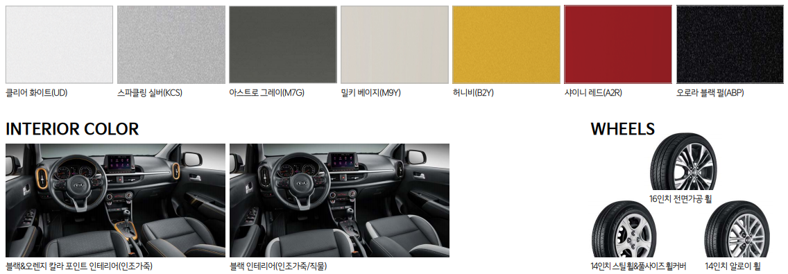 마지막으로 휠은 16인치 전면가공 휠, 14인치 스틸 휠&풀사이즈 휠커버, 14인치 알로이 휠이 있습니다.