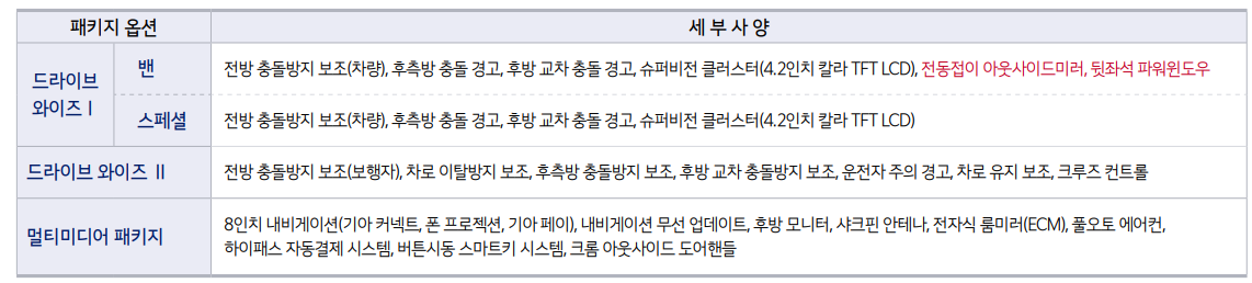 드라이브와이즈Ⅰ은 전방 충돌방지 보조(차량), 후측방 충돌 경고, 후방 교차 충돌 경고, 슈퍼비전 클러스터(4.2인치 칼라 TFT LCD), 후석 승객 알림 드라이브 와이즈Ⅱ는 전방 충돌방지 보조(보행자), 차로 이탈방지 보조, 후측방 충돌방지 보조, 후방 교차 충돌방지 보조, 운전자 주의 경고, 차로 유지 보조, 크루즈 컨트롤, 스타일은 프로젝션 헤드램프, 프론트 LED 턴시그널램프, LED DRL, 프로젝션 포그램프, LED 리어 콤비네이션램프, LED 리피터 일체형 아웃사이드미러 등입니다. 나머지 패키지 옵션은 위 기아 모닝 가격표를 살펴보시기 바랍니다.