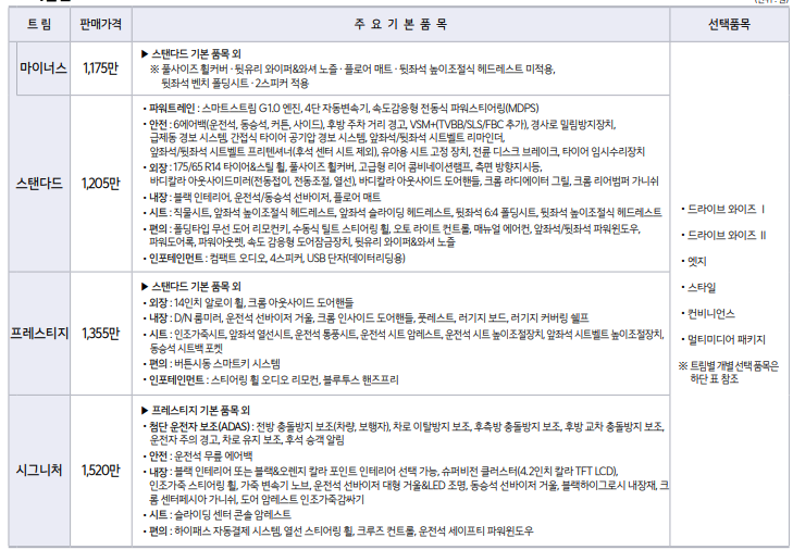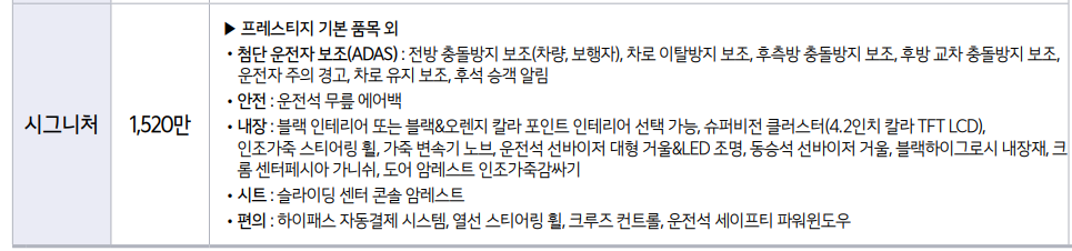시그니처의 기본품목은 프레스티지 기본 품목 외에 첨단 운돈자 보조(ADAS)로 전방 충동방지보조(차량,보행자) 차로 이탈방지 보조, 후측방 충돌방지 보조, 후방 교차 충돌방지 보조, 운전자 주의 경고, 차로 유지 보조, 후석 승객알림, 운전석 무릎 에어백, 블랙인테리어 또는 블랙&오렌지 칼라 포인트 인테리어, 슈퍼비전 클러스터(4.2인치 칼라 TFT LCD), 인조가족 스티어링 휠, 가죽 변속기 노브, 운전석 선바이저 대형 거울&LED 조명, 동승석 선바이저 거울, 블랙하이그로시 내장재, 크롬 센터페시아 가니쉬 도어 암레스트 인조가족 감싸기, 슬라이딩 센터 콘솔 암레스트, 하이패스 자동결제 시스템, 열선 스티어링 휠, 크루즈 컨트롤, 운전석 세이프티 파워 윈도우입니다.