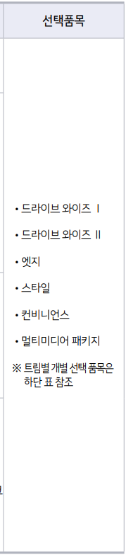 마지막으로 시그니처 기준 드라이브와이즈Ⅰ, Ⅱ는 기본 품목에 속하며 엣지는 70만원, 스타일 50만원, 컨비니언스도 기본품목, 멀티미디어 패키지 120만원, 하이패스 자동결제 시스템 기본 품목, 선루프 40만원입니다.