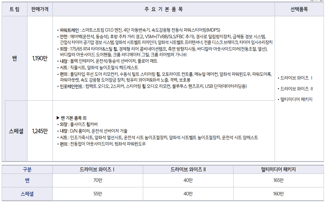 밴은 판매가격이 1,190만원, 스페셜은 1,245만원이며 선택품목에는 드라이브 와이즈, 멀티미디어 패키지가 있습니다.