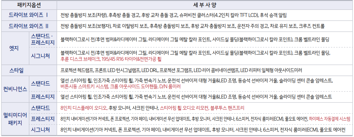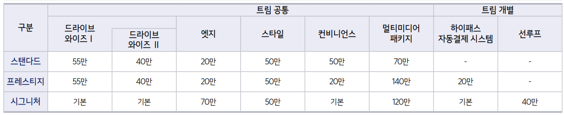프레스티지 기준 드라이브 와이즈Ⅰ은 55만, 드라이브 와이즈Ⅱ는 40만, 엣지 20만, 스타일 50만, 컨비니언스 20만, 멀티비디어 패키지 140만원, 하이패스 자동결제 시스템 20만원입니다.