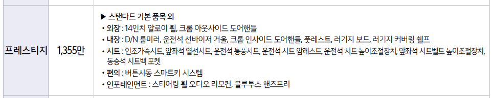 프레스티지의 기본품목은 스탠다드의 기본 품목 외에 14인치 알로이 휠, 크롬 아웃사이드 도어핸들,D/N 룸미러, 운전석 선바이저 거울, 크롬 인사이드 도어핸들, 풀레스트, 러기지 보드, 러기지 커버링 쉘프, 인조가죽시트, 앞좌석 열선 시트, 통풍시트, 운전석 시트 암레스트, 운전석 시트 높이조절 장치, 앞좌석 시트벨트 높이조절장치, 동승속 시트백 포켓, 버튼 시동 스마트키 시스템, 스티어링 휠 오디오 리모컨 블루스트 핸즈프리입니다.