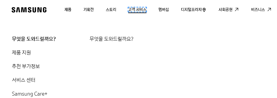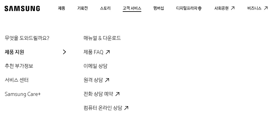 고객 서비스를 클릭하시면 왼쪽편에 제품 지원, 추천 부가정보, 서비스 센터, 삼성 캐어 메뉴가 보일 것입니다.