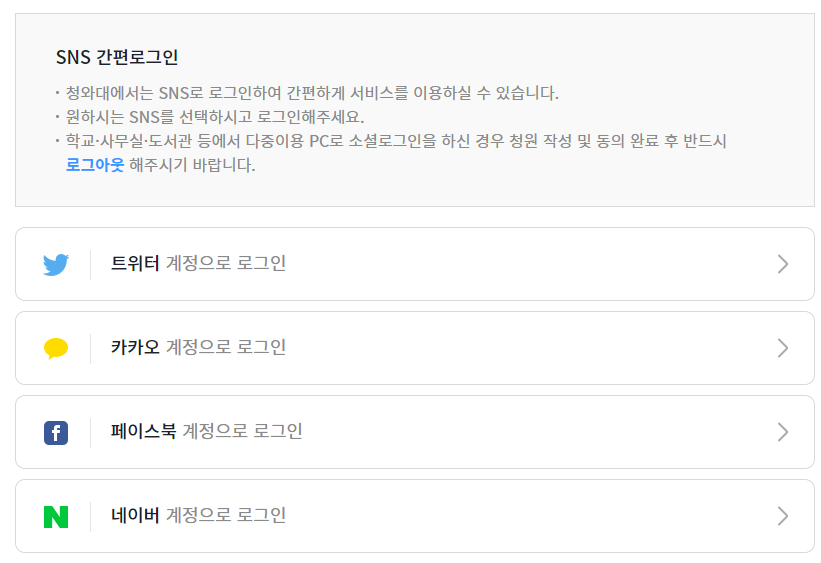 카카오 등 sns 계정으로 로그인을 하실 수 있으니 쉽게 청원 홈페이지를 이용하실 수 있을 것입니다.