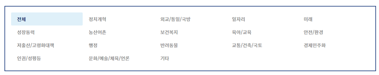외교,통일,국방, 일자리, 미래, 저출산, 행정, 교통, 건축, 국토 등이 보이고 클릭을 하면 그 분야에 대한 모든 청원들을 확인하실 수 있습니다.