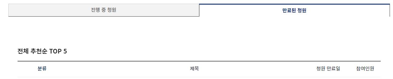 만료된 청원을 클릭하시면 전체 추천순 상위 5개를 확인하실 수 있고 청원 만료일, 제목, 분류, 참여인원을 보실 수 있습니다.