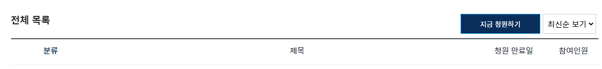 그리고 화면을 아래로 조금 내리시면 진행 중 청원, 만료된 청원을 확인하실 수 있습니다.