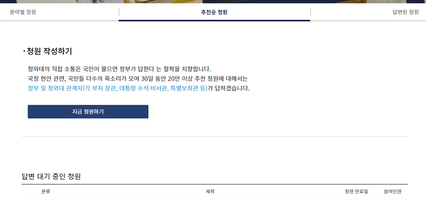 왼쪽 상단을 보시면 분야별 청원이 있고 중앙에는 추천순 정원, 오른쪽 상단에는 답변된 청원이 있습니다.