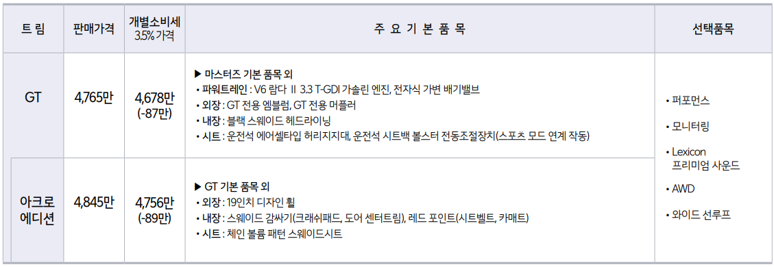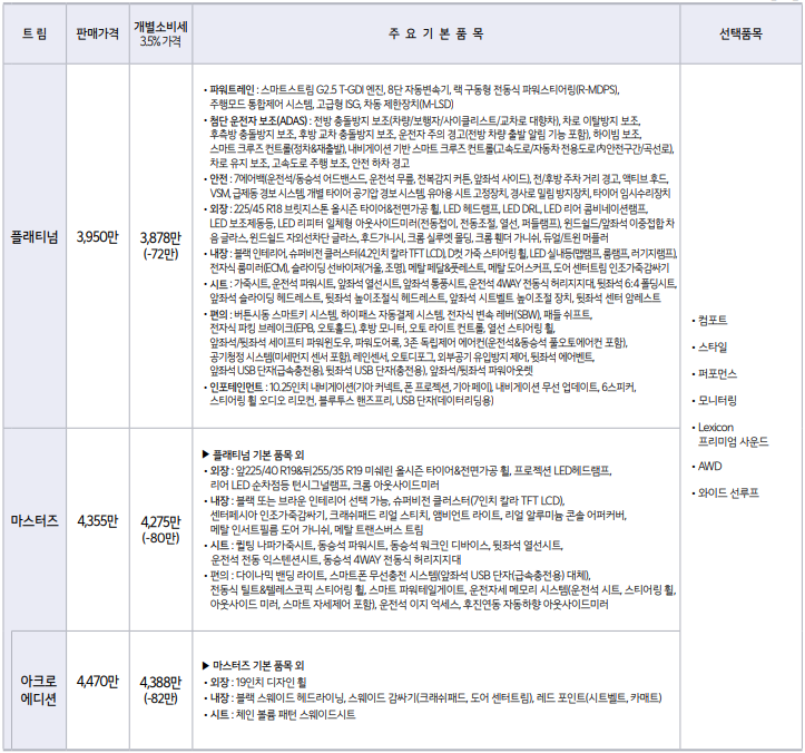 2.5 가솔린 터보에는 플래티넘, 마스터즈, 아크로 에디션 트림이 있고 가격은 플래티넘 3,950만원, 마스터즈 4,355만원, 아크로 에디션 4,470만원입니다. 개별소비세 3.5% 적용시 3,878만원, 4,275만원, 4,388만원입니다.