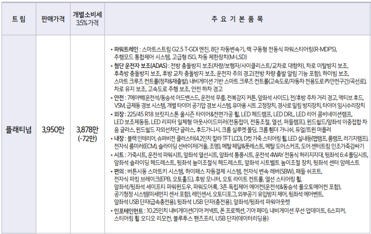 2.5 가솔린 터보 플래티넘의 주요 기본품목에는 8단 자동변속기, 랙 구동형 전동식 파워 스티어링(R-MDPS), 주행모드 통합제어 시스템, 고급형 ISG, 차동제한 장치(M-LSD), 전방 충돌방지 보조, 차로 이탈방지 보조, 후측방 충돌방지 보조, 후방 교차 충돌방지 보조, 운전자 주의 경고, 하이빔 보조 등이 있습니다.