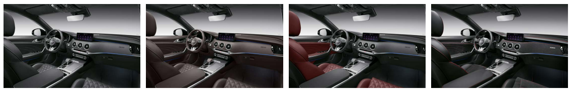 내부인테리어는 왼쪽부터 블랙 인테리어 브라운 인테리어 다크 레드 인테리어(3.3 터보 GT 전용) 아크로 에디션 전용 인테리어입니다.
