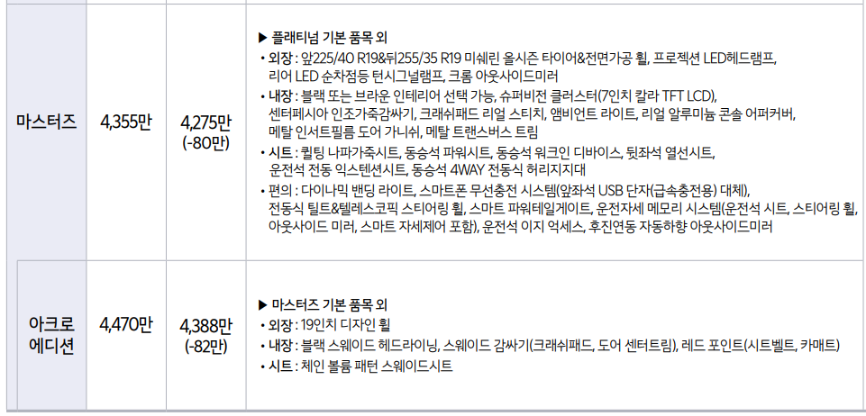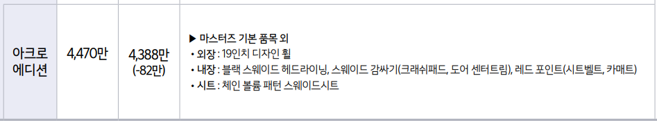 마지막으로 아크로 에디션의 기본 품목은 마스터즈 기본품목 외 19인치 디자인 휠, 블랙 스웨이드 헤드라이닝, 스웨이드 감싸기(크래쉬패드, 도어 센터트림), 레드 포인트(시트벨트, 카매트), 체인 볼륨 패턴 스웨이드시트 입니다.