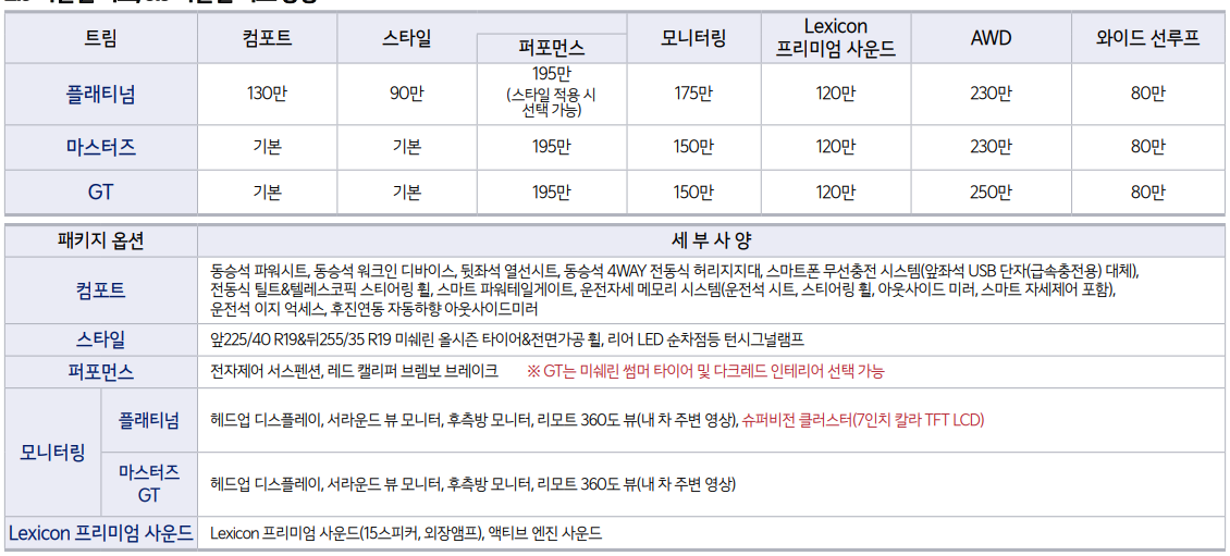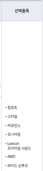 2.5 가솔린 터보의 선택품목에는 컴포트, 스타일, 퍼포먼스, 모니터링, AWD, 와이드 선루프, Lexicon 프리미엄 사운드가 있습니다.