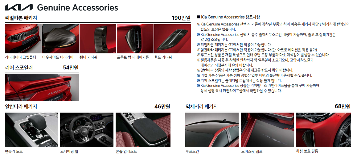 마지막으로, 리얼카본 패키지, 리어 스포일러, 알칸타라 패키지, 악세서리 패키지입니다.