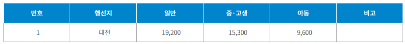 대전행 요금은 일반 19,200원, 중고생 15,300원, 아동 9,600원입니다.