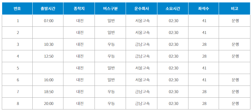의정부에서 대전으로 출발하는 시간은 7시, 10시 30분, 12시 50분, 16시, 18시 50분, 20시 입니다. 소요시간은 2시간 30분입니다.