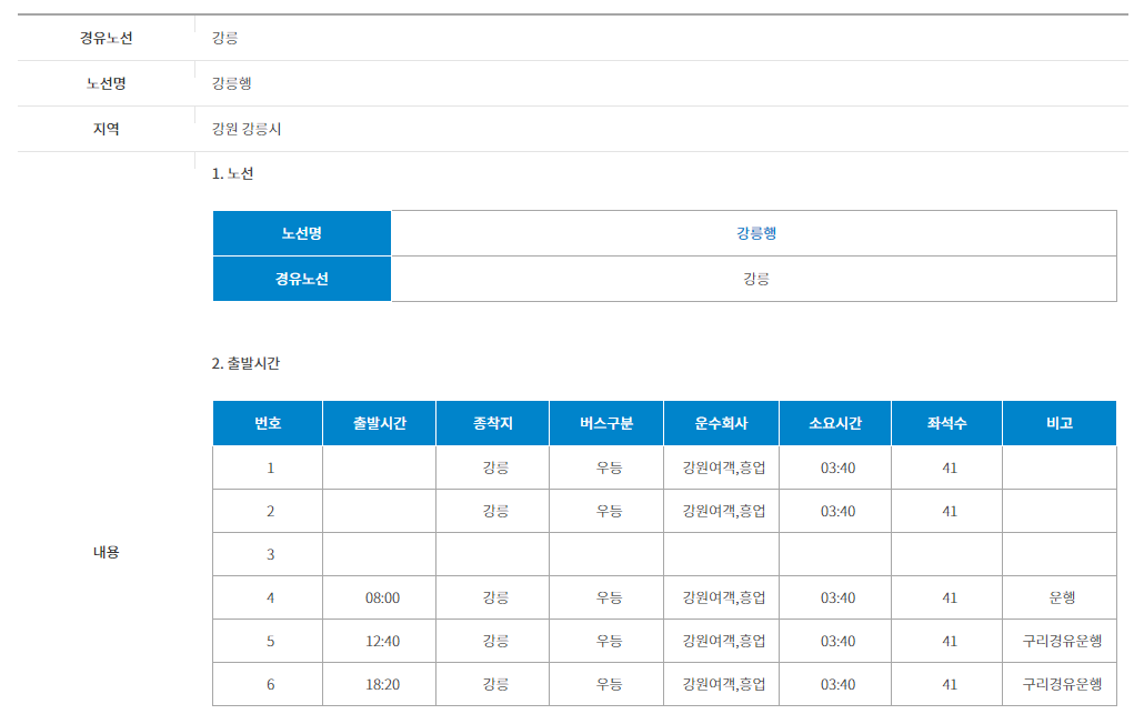 의정부에서 갈릉으로 가는 출발하는 시간은 8시, 12시 40분, 18시 20분이며 소요시간은 3시간 30분입니다.