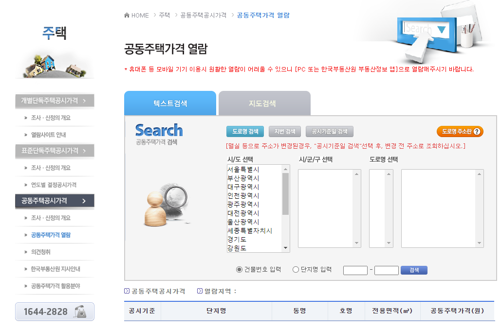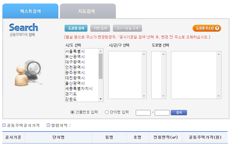 위쪽에는 텍스트 검색, 지도검색이 보이고 아래쪽에는 공시기준, 단지명, 동명, 호명, 전용면적, 공동주택가격이 보입니다.