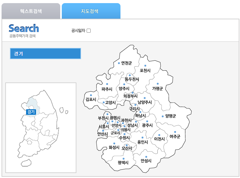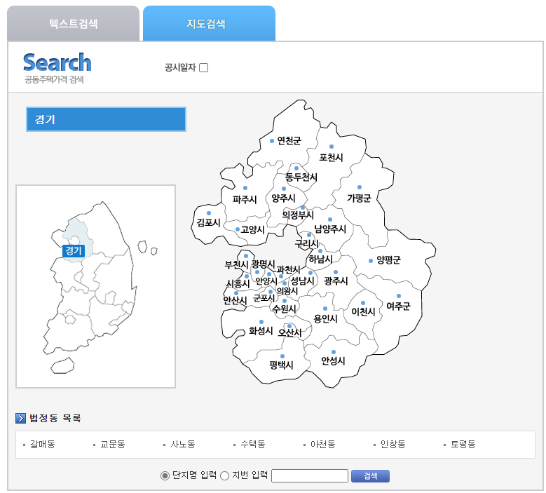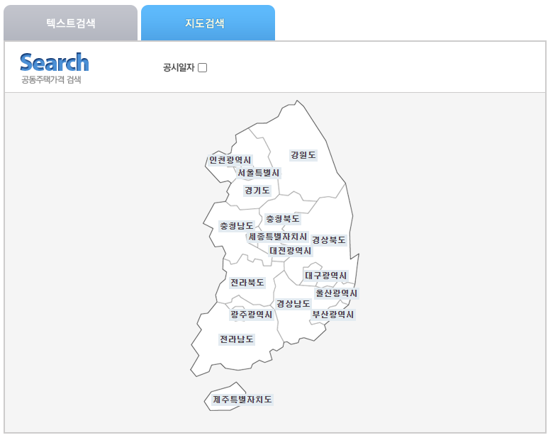 위쪽에서 검색을 하시면 아래쪽에서 아파트 공시지가를 확인하실 수 있습니다. 텍스트 검색, 지도검색 중 편한 방법으로 이용함녀 되고 저는 지도검색을 해보겠습니다.