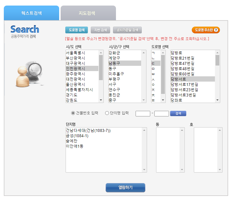 아파트 공시지가조회 방법을 설명드렸는데 혹시나 단지명을 모르시는 분들은 텍스트 검색을 이용하시면 됩니다.