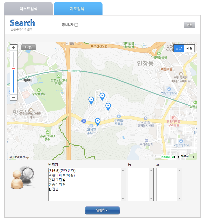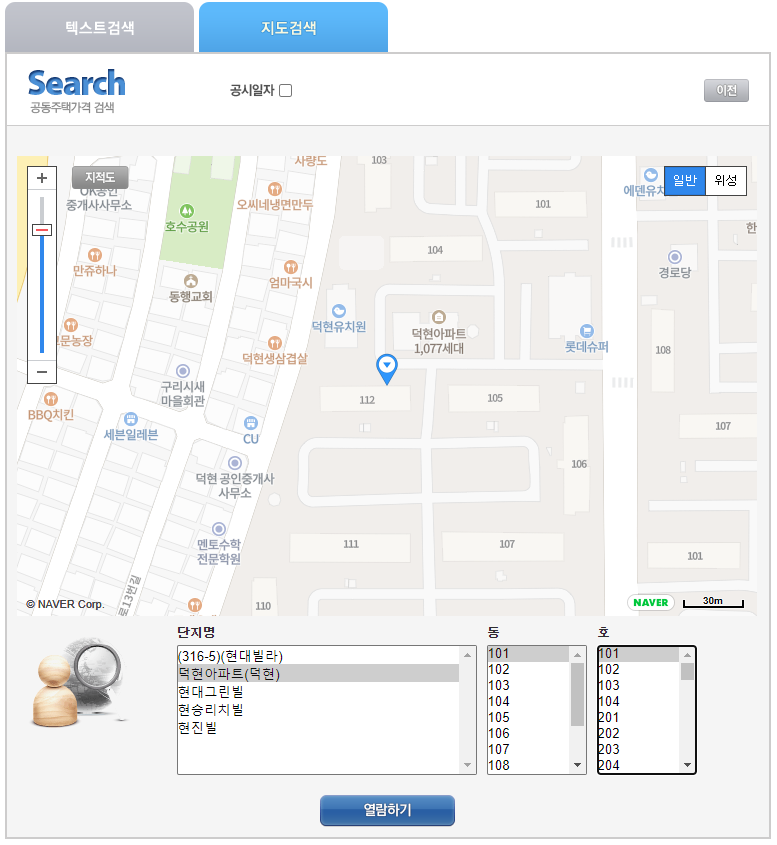 검색된 아파트중에서 하나를 클릭하면 위 화면처럼 동, 호수를 선택할 수 있게 됩니다.