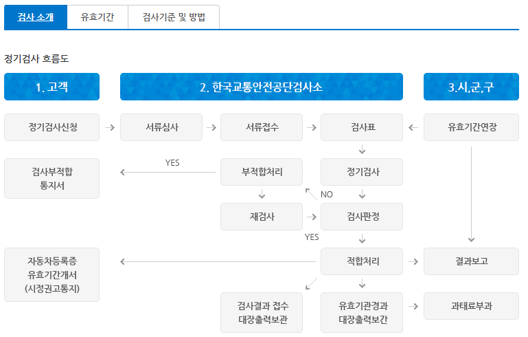 자동차 정기검사는 정기검사 신청 -> 서류심사, 서류 접수, 검사표, 정기검사, 적합 처리, 자동차등록증 유효기간개서 순으로 진행됩니다.