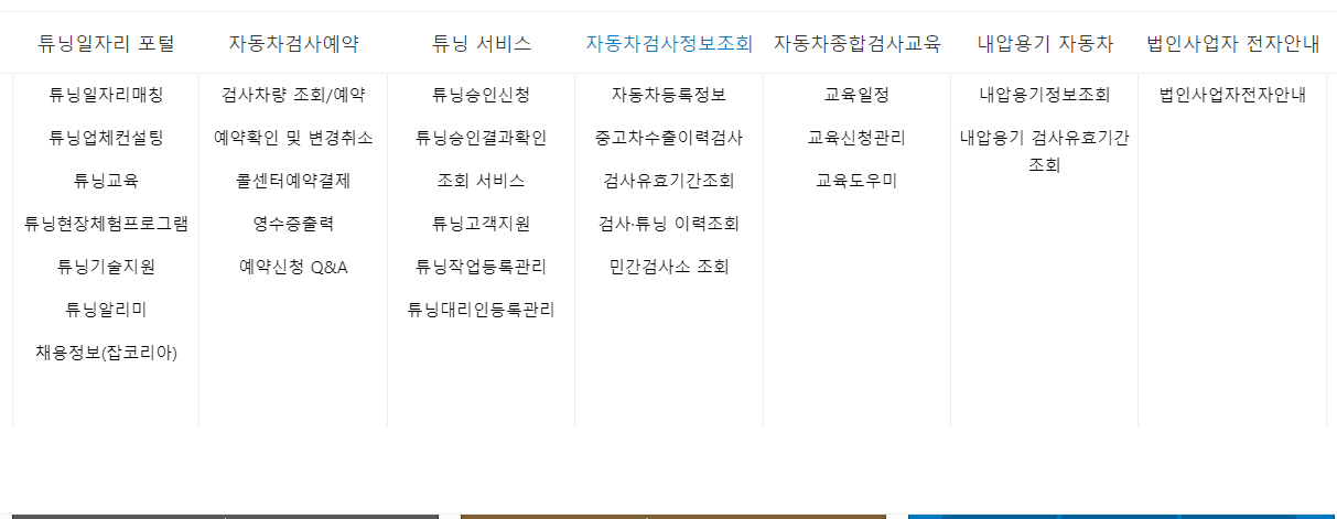 자동차검사정보조회 메뉴에 마우스를 올리시면 여러가지가 나오게되고 자동차검사정보조회 메뉴에서 3번째를 보시면 검사유효기간조회가 있습니다.