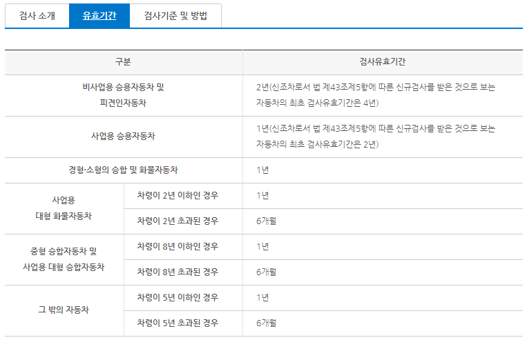 자동차검사 유효기간은 비사업용 승용자동차 및 피견인 자동차는 2년, 사업용 승용자동차는 1년, 경형 소형의 승합 및 화물자동차는 1년입니다.