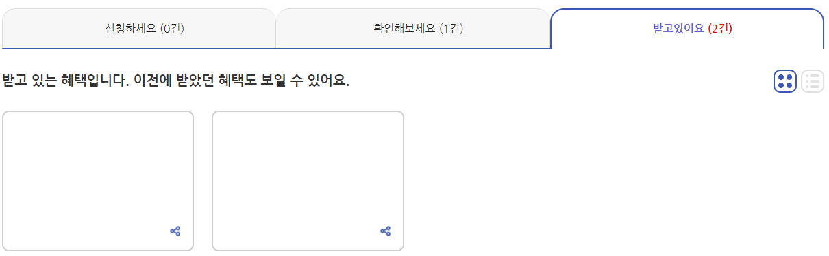 저는 현재 받고 있지않지만 받았던 혜택이라서 받고 있어요 메뉴에서 2건을 확인할 수 있었습니다.