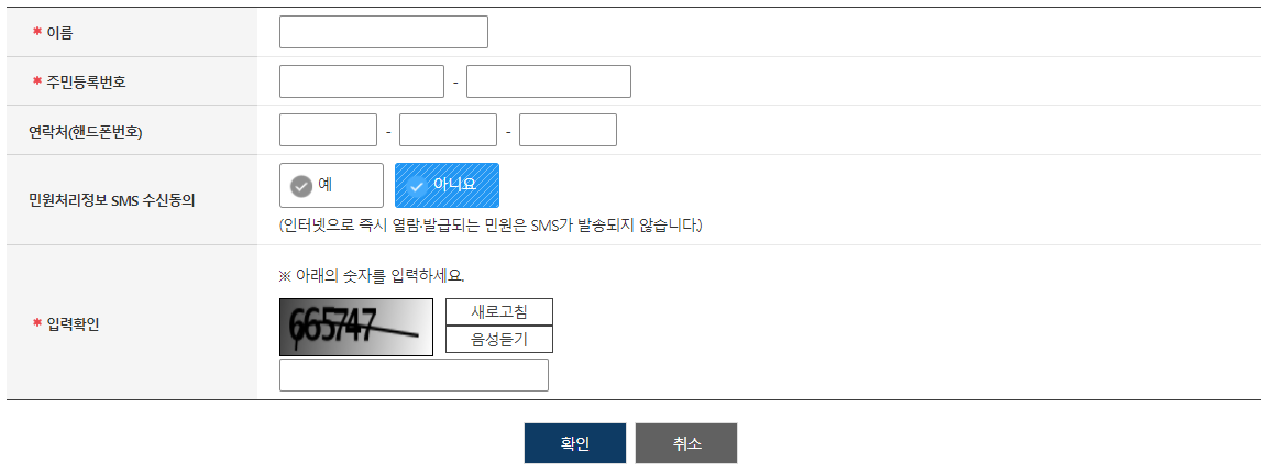 비회원이라도 신청을 할 수 있는데 비회원인 경우 비회원 신청정보를 입력하여야 하기때문에 이름, 주민등록번호를 입력 후 아래쪽에 확인 버튼을 클릭하시면 됩니다.