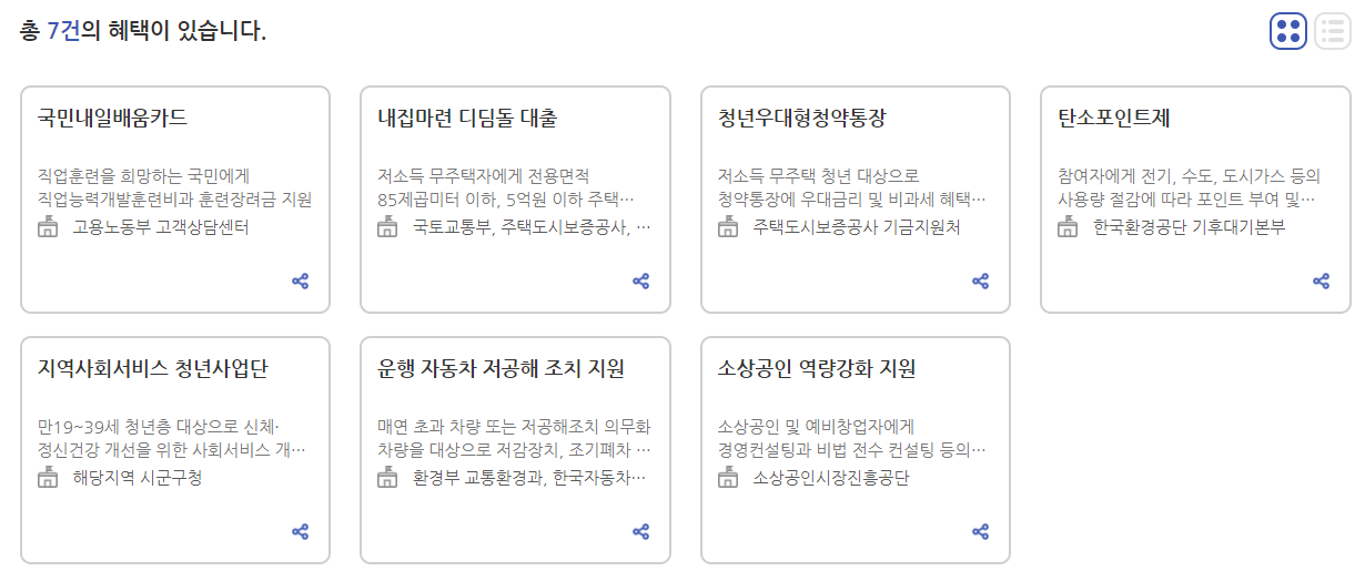성별, 연령대, 소득구간, 개인특성, 가구 특성을 선택하시면 마지막에 조건에 해당하는 혜택들을 한눈에 확인하실 수 있습니다. 검색이 되더라도 대상에 해당하지 않을 수가 있는데 정확한 내용은 클릭하셔서 기관에 직접 문의를 해보셔야 합니다.
