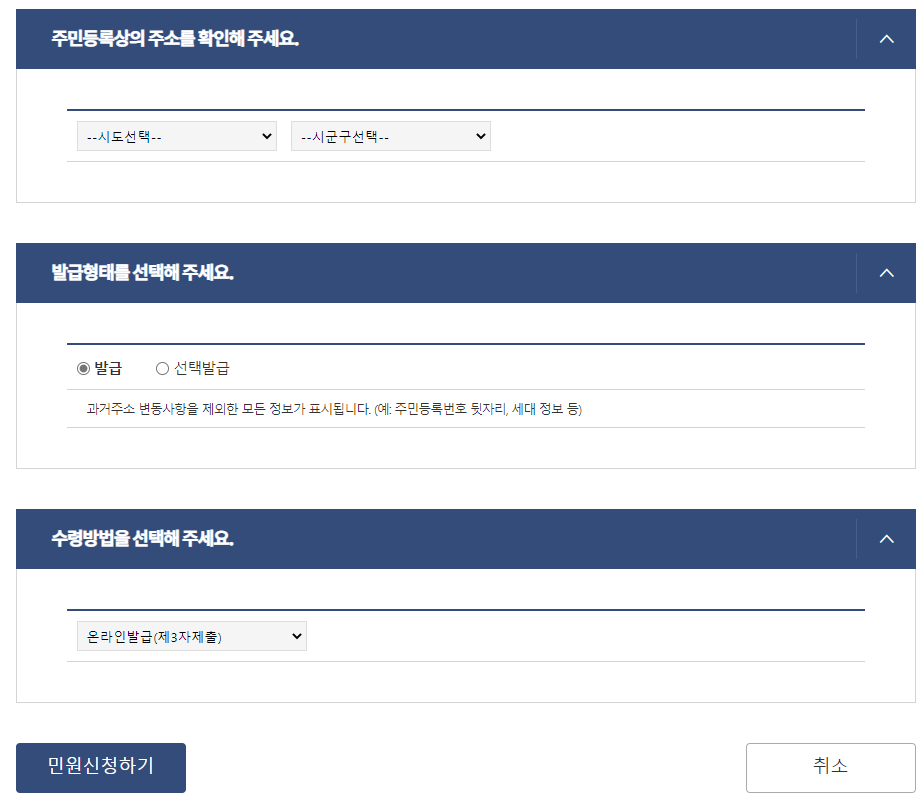 초본 기준으로, 주민등록상의 주소, 발급 형태, 수령방법을 선택 후 민원 신청하기를 클릭하시면 됩니다.