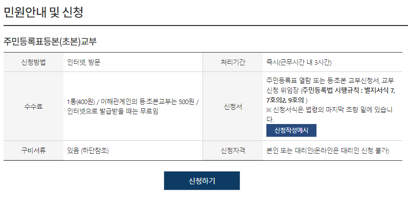 대부분 정부24 홈페이지에서 발급받을 수 있기때문에 신청방법에서 '인터넷'이 보일 것입니다. '인터넷'이 있으면 바로 아래쪽에서 신청하기 버튼을 클릭하실 수 있습니다. 그리고 보시면 수수료가 나와 있는데 수수료는 1통 400원, 이해관계인의 등초본 교부는 500원, 인터넷으로 발급받을 때는 무료라고 되어 있습니다. 정부24시 홈페이지에서 주민등록등본을 교부 받을 경우에는 인터넷이기때문에 수수료는 무료입니다.
