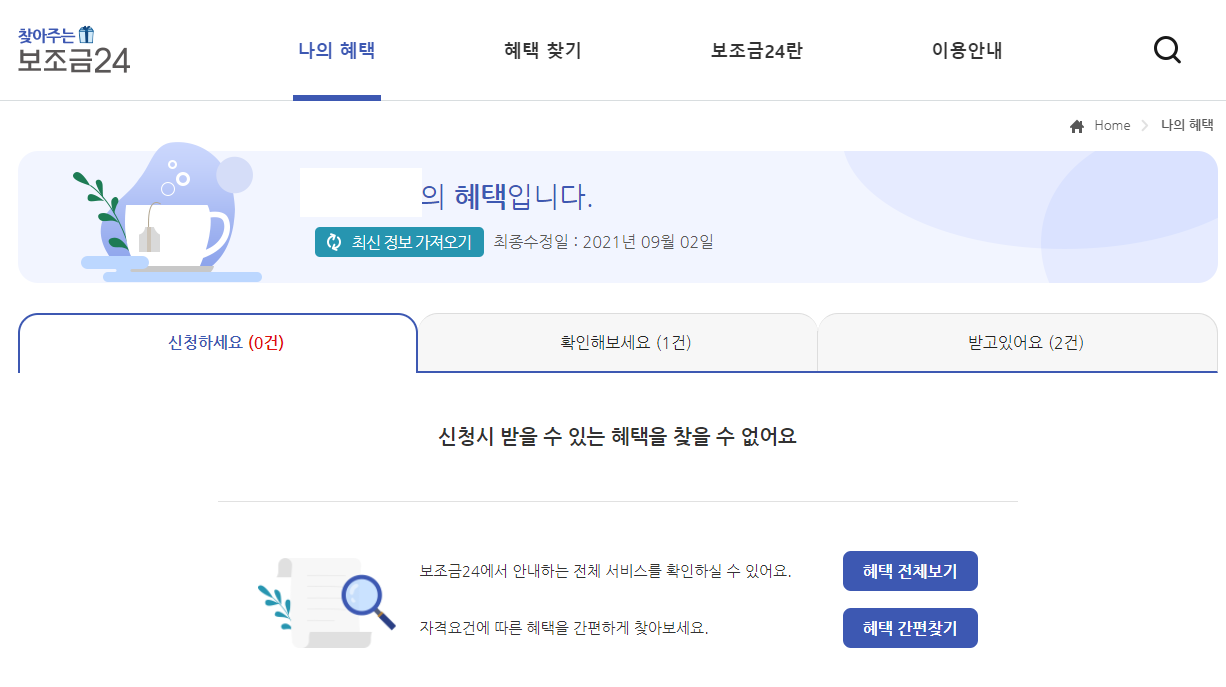 만약에 받고 있는 혜택들이 있다면 받고 있는 혜택에서 확인하실 수 있습니다.