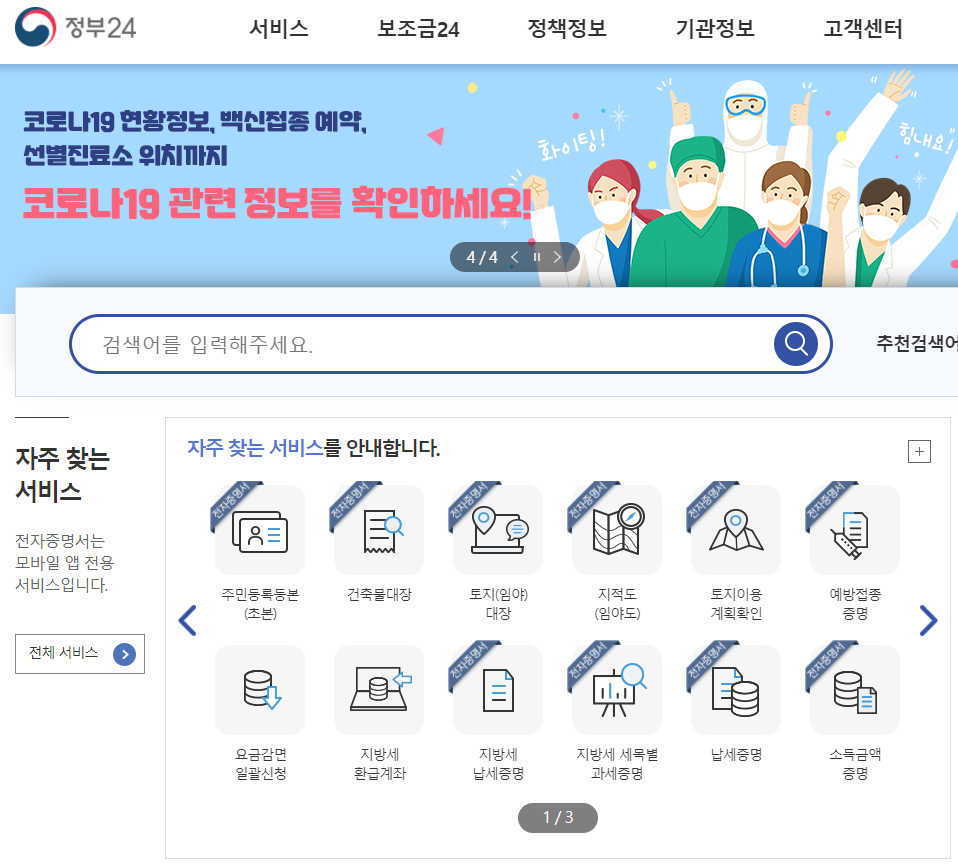 정부24 홈페이지의 주소는 gov.kr 이며 검색하면 바로 찾으실 수 있을 것입니다.