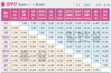 처음보시는 분은 표가 이해가 안가실 수가 있는데 표를 보시면 빈칸이 보일 것입니다. 빈칸에서 상하 좌우로 지역으로 도착 했을 때 가격이라고 생각하시면 됩니다. 이게 무슨 말이냐면 동탄 아래쪽에 빈칸이 보일 것입니다. 동탄에서 지제 까지는 일반실 기준으로는 오른쪽으로 보셔야 하기때문에 7,500원, 특실은 아래쪽으로 보셔야하기때문에 10,900원입니다.