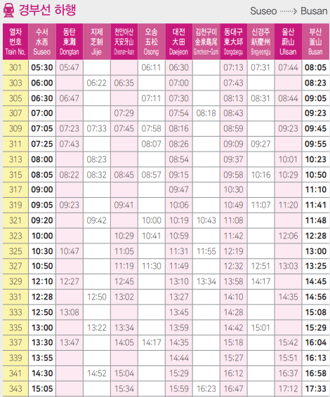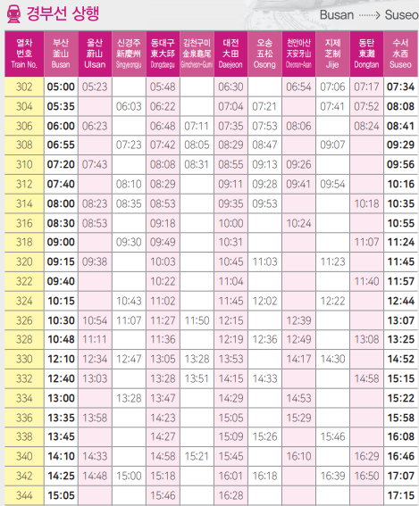 부산 기준으로 5시, 5시 35분, 6시, 6시 55분, 7시 20분, 7시 40분, 8시, 8시 30분, 9시, 9시 15분, 9시 40분, 10시 15분, 10시 30분, 10시 48분, 12시 10분, 12시 40분, 13시, 13시 35분, 13시 45분, 14시 25분, 15시 5분입니다.