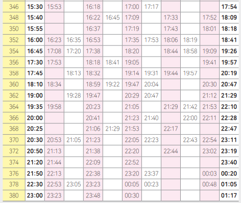 그리고 15시 30분, 15시 40분, 15시 55분, 16시, 16시 45분, 17시 30분, 17시 45분, 18시 10분, 19시, 19시 35분, 20시, 20시 25분, 20시 30분, 20시 50분, 21시 20분, 21시 50분, 22시 30분, 13시 입니다.