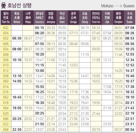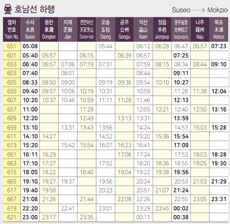 수서역에서 출발하여 목포까지가며 수서역 기준으로 5시 8분, 5시 40분, 6시 40분, 7시 40분, 8시 33분, 9시 40분, 10시 20분, 11시, 12시 20분, 13시 10분, 14시 10분, 15시 20분, 16시 11분, 17시 10분, 18시 5분, 19시 10분, 19시 40분, 21시 8분, 22시 20분, 23시입니다.