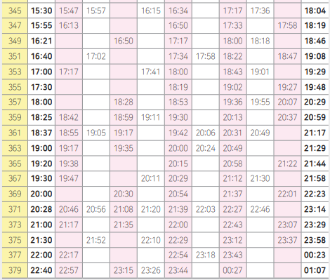 그리고 15시 30분, 15시 55분, 16시 21분, 16시 40분, 17시, 17시 30분, 18시, 18시 25분, 18시 37분, 19시, 19시 20분, 19시 30분, 13시 30분, 20시, 20시 28분, 21시 21시 30분, 22시, 22시 40분입니다.