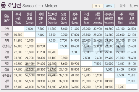 수서에서 목포까지 일반실 기준 46,500원, 수서 에서 목포까지 특실 기준 67,400원입니다. 그리고 만약에 정읍에서 수서로 간다고 하면 운임은 일반실을 이용할 경우 33,900원, 특실을 이용할 경우 49,200원입니다. 이제 대충 이해를 하셨을 것이라고 생각하는데 다시 약간만 더 설명드리면 일반실은 빈칸을 기준으로 목포행 하행은 오른쪽으로 가면서 계산을 하시면 되고 수서행 상행은 빈칸을 기준으로 위쪽으로 가면서 계산을 하시면 됩니다. 지제역에서 수서까지는 7,700원, 지제에서 익산까지는 20,400원이 나오게 되는데 이해가 안되실 수도 있지만 표를 계속 보시다보면 이해가 되리라 생각됩니다.