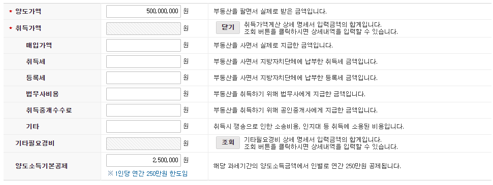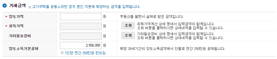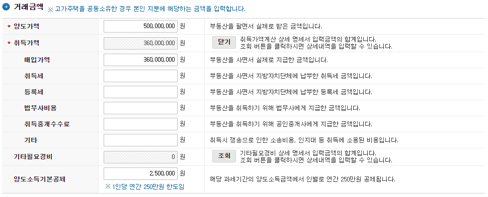 거래금액에서는 양도가액, 취득가액을 입력하시면 되는데 양도가액은 빈칸에 바로 입력을 하실 수 있지만 취득가액은 바로 입력을 할 수가 없을 것입니다.