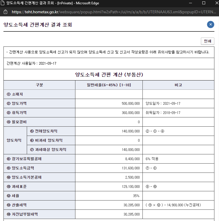 정확하게 입력한 후 세액계산하기 버튼을 클릭하시면 바로 양도세 자동계산 결과를 확인할 수 있습니다.