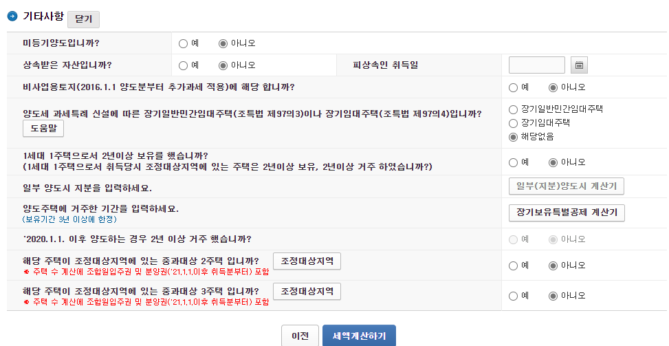 이제 마지막으로 양도세 자동계산을 위해서 기타사항을 선택 하여야 하는데 미등기 양도인지, 상속받은 자산인지, 1세대 1주택으로서 2년 이상 보유 했는지, 조정 대상지역인지 등을 선택하여야 합니다.